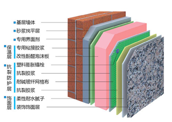 整體構(gòu)造:找平層、粘結(jié)層、酚醛泡沫板保溫層、酚醛板錨固、抹面膠漿夾耐堿玻纖網(wǎng)格布、柔性抗裂膩子層、飾面層。